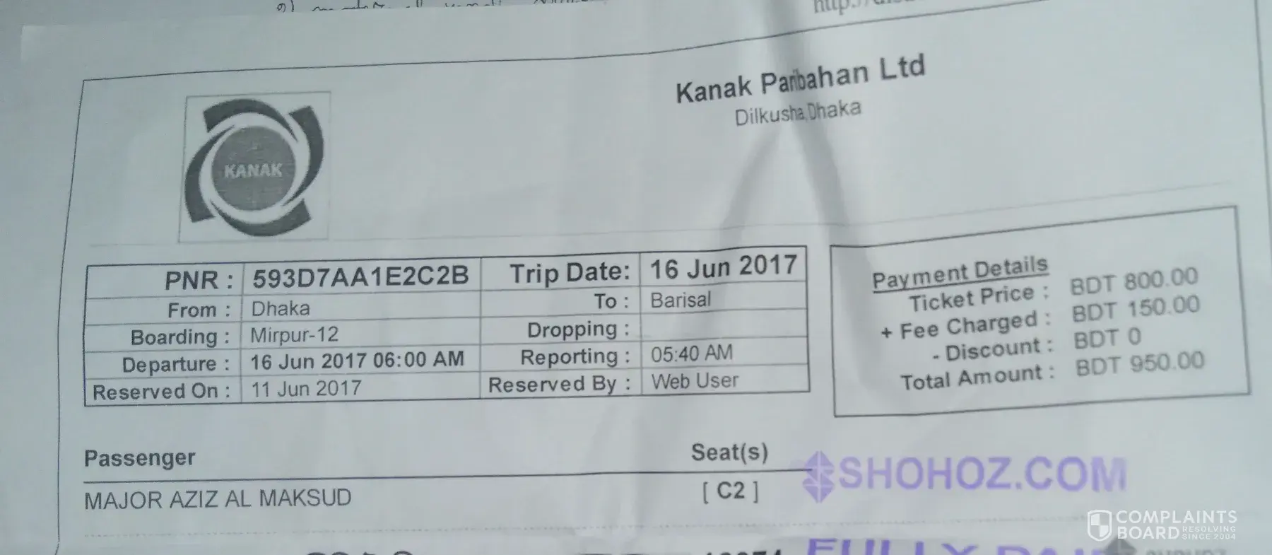 I bought a bus ticket of kanak Paribahan AC 5 days prior journey through shohoz.com. I reported at due time to counter but they told that they don't run any bus at that time. It was very shocking and frustrating. I had a lot of pain reaching the counter after facing heavy rainfall and droughts. Shohoz.com should have verified before distributing any bus ticket.