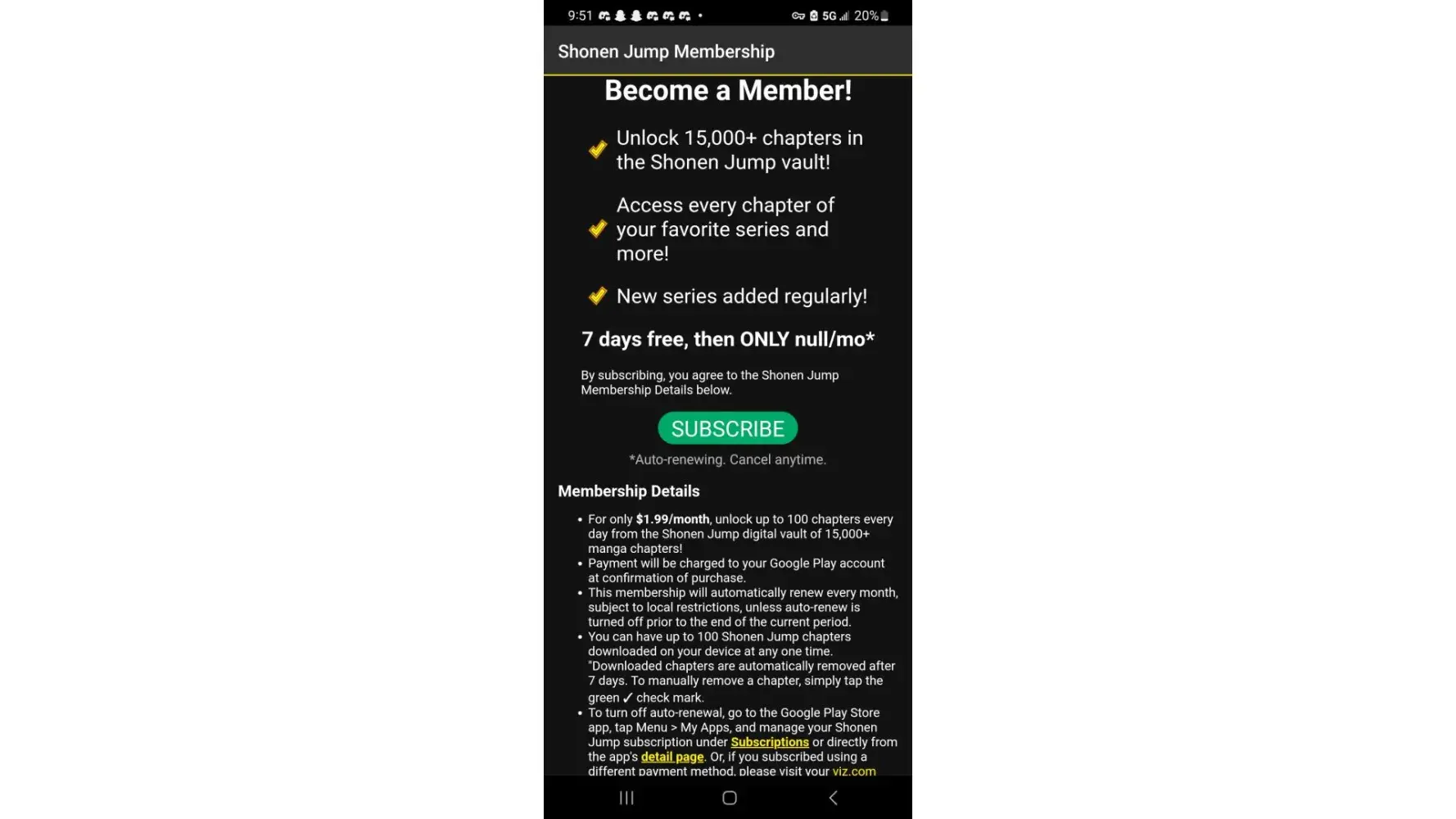 This issue is specific to the membership of Shonen Jump rather than the app itself- pricing. While inexpensive in short term i do NOT like paying for any service monthly. Also dont appreciate as a consumer, that no other options exist such as a 6 month or preferably annual package.
