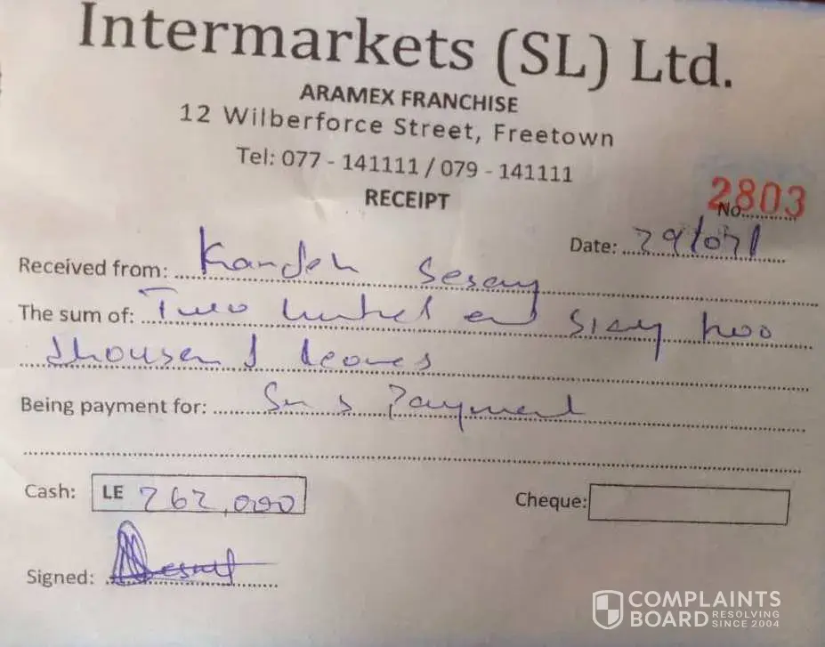 see below of payment made with my Visa Card and attached receipt from Aramex office in Freetown