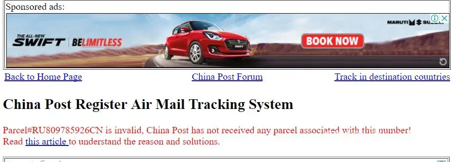 It says "Parcel#RU809785926CN is invalid, China Post has not received any parcel associated with this number!"