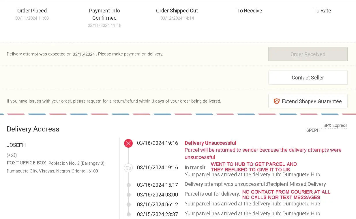 So once again, we were tried to retrieve our parcel from the Shopee courier who never sent any message to us nor contacted us in any way. We had sent out several messages to other Shopee couriers to gain any information on where our parcel was located or who had the parcel but no response at all! And then we saw that the courier added a message in Shopee that he allegedly could not contact the recipient- NOT TRUE AT ALL! Our mobile had no missed calls nor text messages! We physically went to the Shopee hub to get our parcel. The Shopee hub refused to give us our parcel and said we have to contact the courier rider! They gave us the name and mobile of the courier [Julius Cielo, [protected]]. We tried calling him 3 times while at the Shopee hub and he hung up on us (witnessed by Shopee guard and Shopee employee laughing right in front of us,{have video}). Then the courier rider sent a text message saying his mobile had low power and he was in CEBU! Not sure why the Dumaguete courier rider was in Cebu instead of delivering our parcel to our Dumaguete address nor allowing us to just pick up our parcel at the Shopee hub. Then the Shopee Courier returned our parcel to the seller without allowing us to pick up the parcel after knowing we were physically there at the HUB requesting our parcel. Who wins with this type of business process?! This process seems void of any good communication and should not be expected nor accepted in any professional business online transactions! Since this seems to happen all too often and reporting it to Shopee seems laughable, we will simply thought its best to report these Shopee incidents to any and all who are equally disappointed with this issue. And most likely, we expect Shopee to block our purchases and/or cause issues with our deliveries like they have done to so many other customers who dared to complain. Seems childish...but still sadly realistic...=)