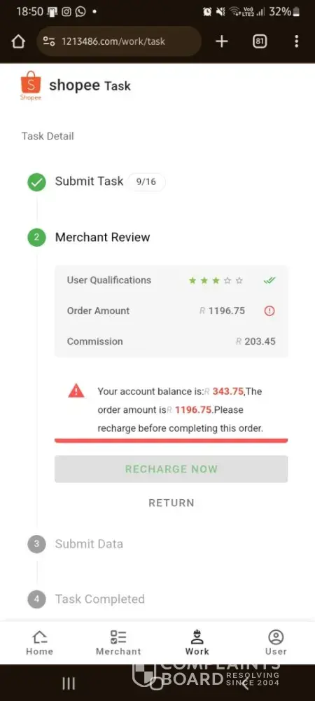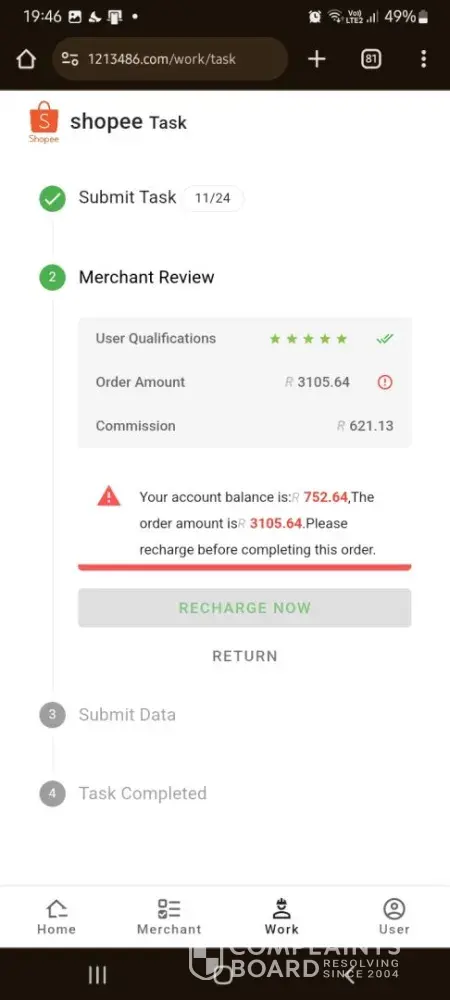 I've been scammed out of R5000 on 02 June 2024. I registered on shopee to make extra income. You complete task to make a profit. They let you pay a certain amount to a distributor and then tasks are completed, however on the third task they asked for r12000, money that I do not have and I explained this to them and they said they can not help me and now I've lost all my money and there's no way to get it back.