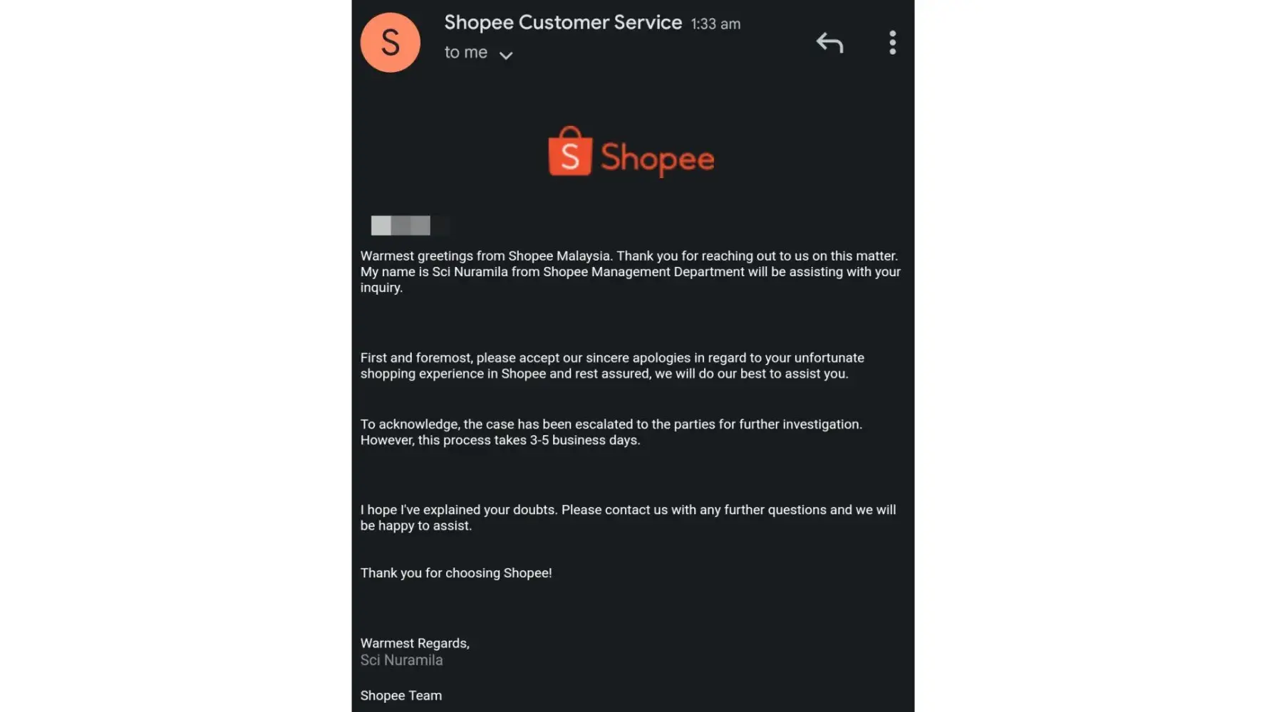After the 5 working days, I ask again for updates but there's no any reply. After 4 days I sent for updates (3/5/2022), shopee team reply me with "kindly wait for 3 to 5 working days".