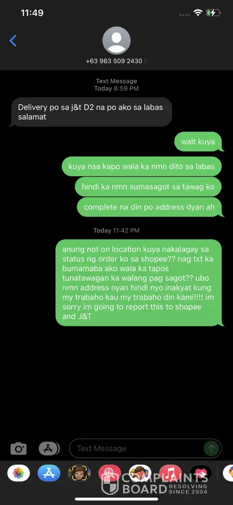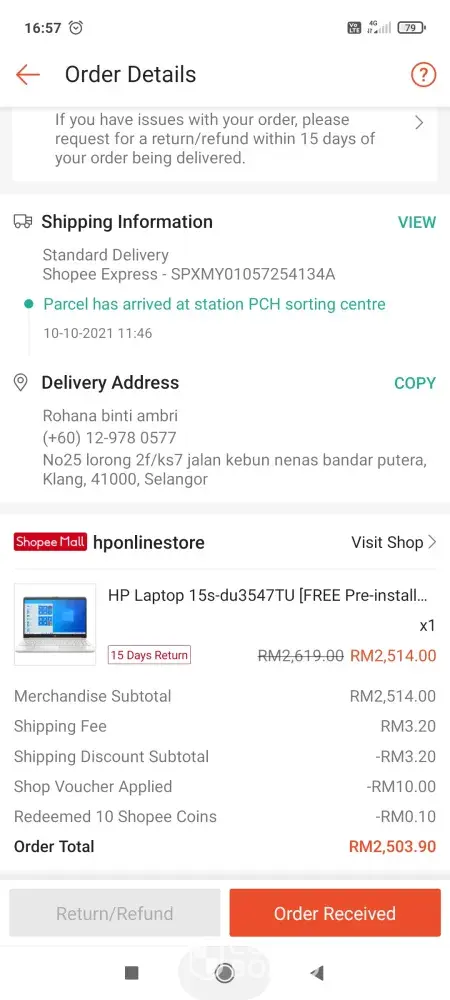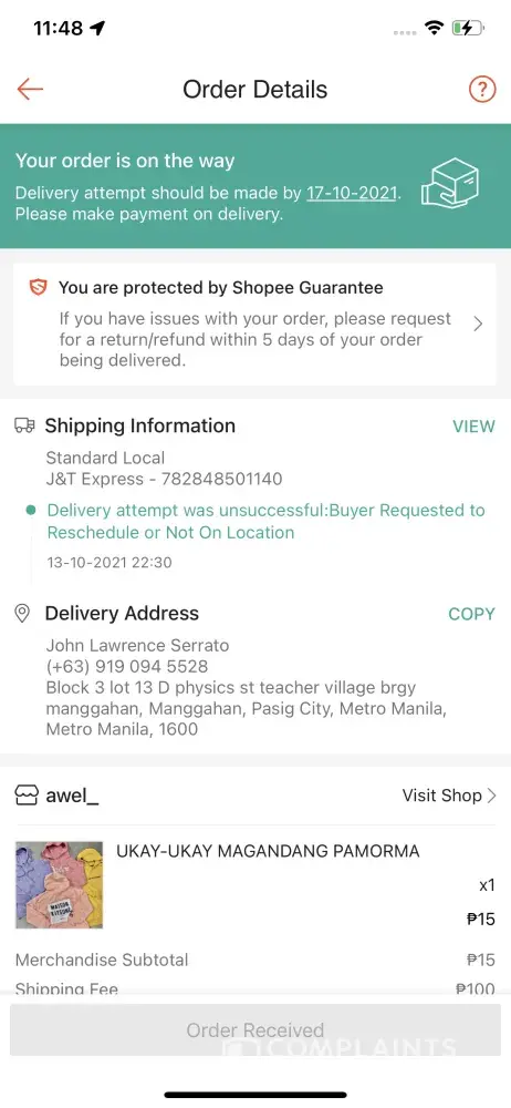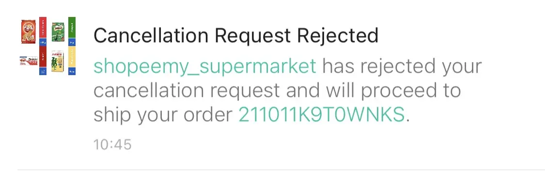 Saya buat tempahan barang dengan Shopee Supermarket pada 11/10/2021. Semua barang yang saya tempah ada tag ‘next day delivery'. Saya buat tempahan dengan shopee supermarket sebab tag tersebut dan saya memang memerlukan barang tersebut dengan segera. Tapi malangnya, sehingga 14/10/2021, barang tersebut masih belum dipos keluar oleh shopee supermarket. Ini bermaksud pihak shopee supermarket tidak memenuhi polisi ‘next day delivery' seperti yg tertera di aplikasi dan laman kedai mereka. Ini juga telah menidakkan hak saya sebagai pengguna di mana saya berhak menerima barang saya pada hari berikutnya setelah tempahan dibuat. Pihak shopee supermarket ternyata telah GAGAL. Saya telah membuat cancellation request pada 13/10/2021, tapi pihak shopee supermarket sekali lagi telah bertindak menidakkan hak saya sebagai pengguna dengan menolak cancellation request tersebut. Ini sangat tidak adil kepada saya sebagai pengguna. Saya mohon pihak shopee supermarket diambil tindakan sewajarnya kerana kegagalan mereka dan sikap mereka yang bertindak kurang ajar kepada pengguna.
