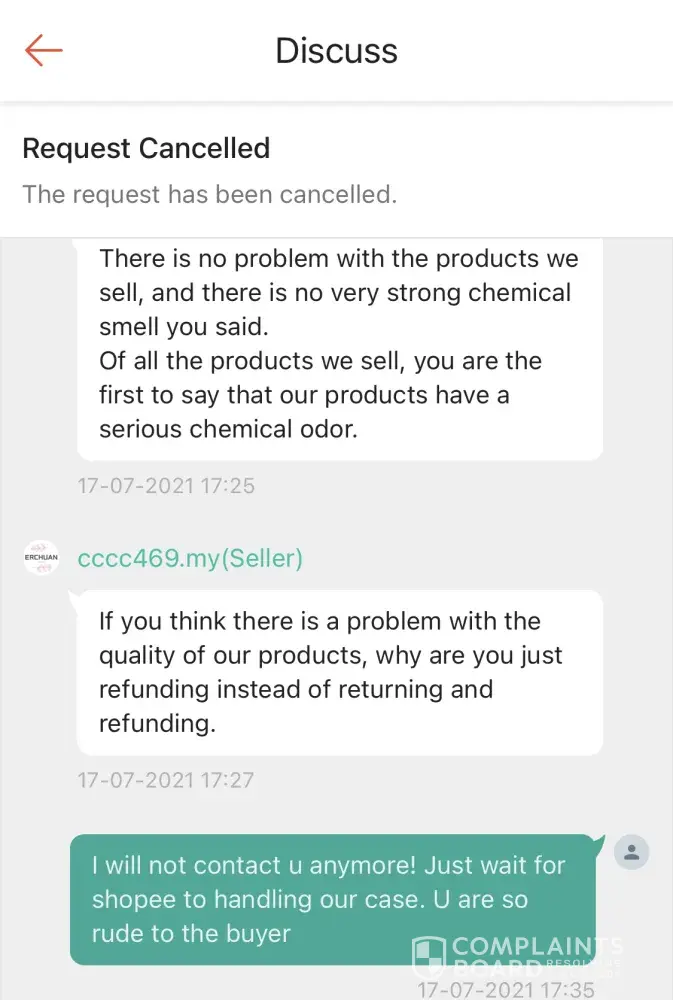 I can't get refund because of the quality of big stink smell of chemical? Seller is not responsible and yet Dispute Agent simply reject and didn't resolve my case. I had lodge official report to Ministry of Consumer Affairs and to the mother company SEA GROUP. If this small case can't resolve better don't open e-commerce business and hired those unprofessional employees who spoil your company reputation name. I am not going to tolerate if HOD Shopee can't resolve. I will lodge any government tarnish your company until bankruptcy!