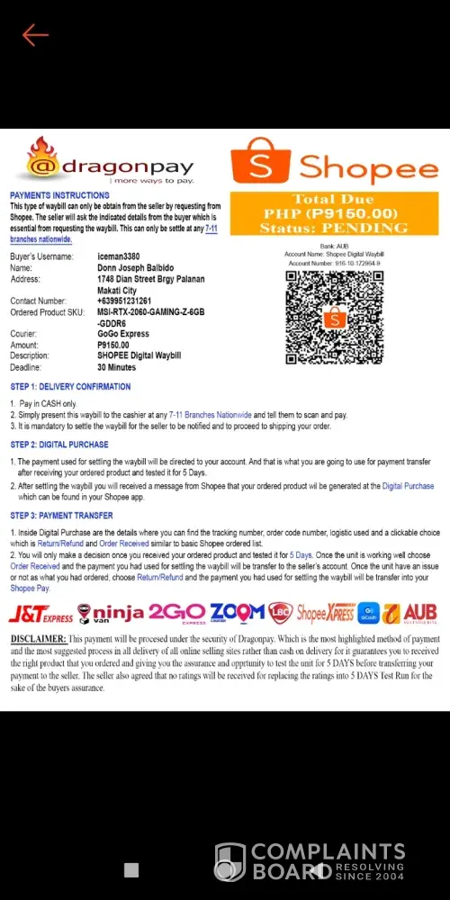 I ordered on shopee dated Nov 15, item from China. The item arrived in philippines on Nov 23, on the following day Nov 24 when I check the status it says item is on the way to deliver by the courier at 1pm. Then I waited all day for the courier to came. Then at 7pm to my surprise when I check the status of my delivery there is saying that parcel will return to the sorting hub because it was rejected by the user. I immediately contacted shopee agent to report what happened. Why the driver reported like that. Then agent told me they will do an action and wait for the item it will be delivered within 24hrs. Then the following day, Nov 25 around 8pm no courier came. I contacted again shopee and reported it again, then shopee agent assured me that my parcel will be delivered the following day so stop worrying. And then today, when I checked the status it was returning to the seller! I was like what the heck, come on shopee! 2 consecutive days I've been reporting this matter and then nothing happened? I contacted agent again and rely everything again and again then agent told me sorry because its already returned to seller, all they can do is to file a report against this driver. Oh really? Just now agent told me they will file a report.. Wow! Pls somebody help me to finally give this driver his award for being beast!