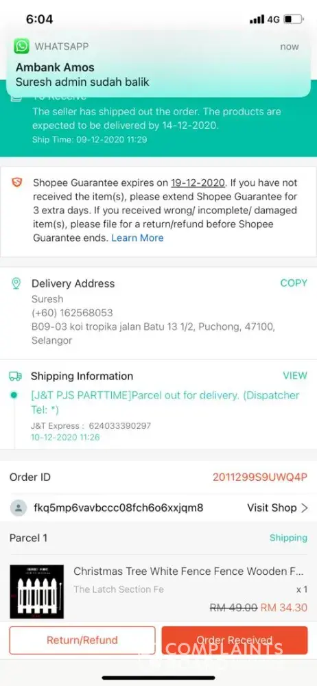 Full description of the incident: I received a call while at work today that the order I had place (Order ID: 2011299S9UWQ4P) is being delivered and the delivery guy (Dispatched by J&T PJS EXPRESS - PART TIME) was waiting at the guard house of my condominium. I had instructed him to head to the lobby of my block (which is the stated address of the delivery) and I will instruct my wife to come down to the block lobby to collect the items. The guard house is a considerable distance from my block and my 4 kids (ages 4 to 8) were at home with my wife. However, the delivery guy had replied over the call that he was going to wait at the guard house and not head to my block (again, the delivery address stated on the order is my block and not the guard house). I had told him politely that my kids are home and my wife is unable to walk such a long distance to the guard house. Upon which, he start scolding me in vulgarities and replied that it is not his problem, acting in a rowdy and gangsterism manner. The security at the guard house then informs me that he has brought 2 other friends and was picking a fight. I instructed my condo security to chase them away and not allow them into the condo as I feared for the safety of my wife and kids. My item was not delivered and this has promptly affected my work (which I was in the middle in) and now I am fearful of what may happen to my wife and kids given the nature and actions of the delivery guy (as he has my full address in his records).