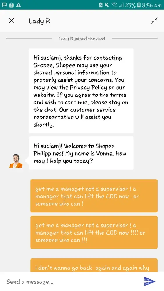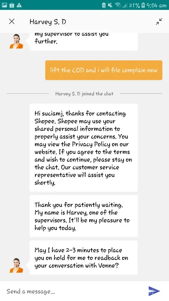 I was chatting with the agent named Pia and as we are chatting i want to talk to a supervisor as i mentioned that why the customer unable to have a discount to keep as it is the most covenient as it is pandemic the return of the item and re order is kinda hassle. I said i wanna speak to the sup as the agent mentioned they cant change it as the team already decide the return of the item. Also the Sup cant do anything. Wth? Your the Supervisor as when there is an escalation you will speak yo the customer and not being irrrsponsible and closed the chat. Shopee has no rating on there chat that is why they can close it without the customer provide their feedback.
