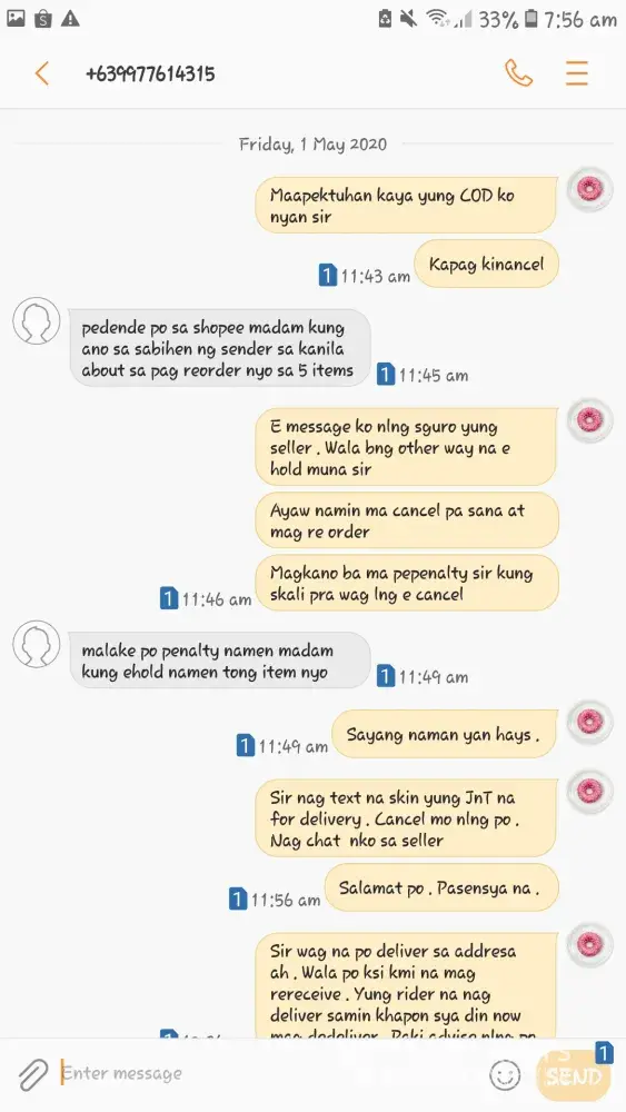 So, I supposed to receive 5 order, however because of an emergency called us no one will be available to receive the parcels before May 08 . Right after I knew that there's a possibility my order will arrive before May08 I reached the sellers letting them know that I won't be available to receive the parcels before May 08 if those will arrive earlier than May 08 . They told me ask the courier cause they already ship out the items and they don't have control with it . Okay, Since couriers haven't pick up the items yet, I contact shopee customer service first . Letting them know about my request to have it deliver before May 08, they said that they don't have control as well to the courier once they pick up the parcels. Okay fine . I contacted the courier every day I even get mad to them because they are unreachable but then one day when the parcels arrived to their warehouse they phoned me !let me know tht they can't hold the items until May 08 because they will have penalty they can only hold for 2 days I guess . So we agreed to have it reorder instead . As well as the seller ! Now the removed my COD option and they can't lift is right away . I'm pregnant and it's frustrating that I can't check out my baby essentials ! The supervisor that I spoke left the chat wihout informing me and resolving my issue ! I need to have it investigated !