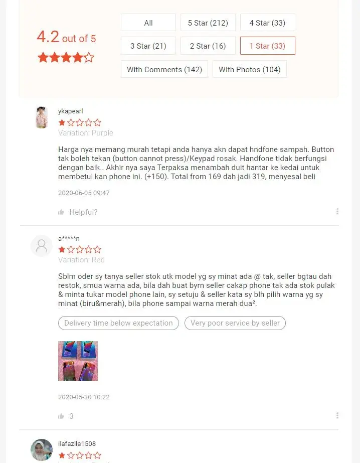 please look at the uploaded photos, u may google translate the language from malay to english to understand how disappointed are them. Seller never reply once you make a payment