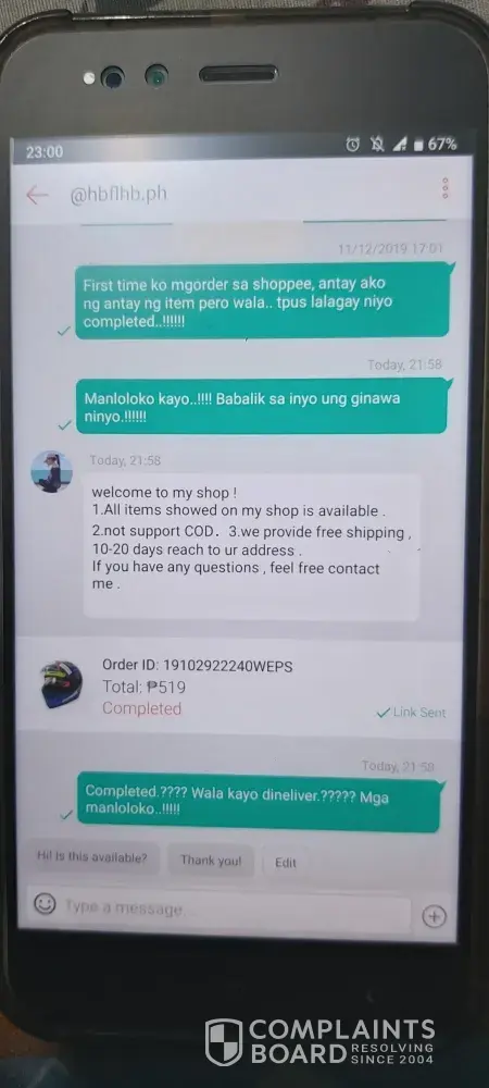 Seller noticed that the item is already completed but i do not received any helmet. Seller also indicated that they are not supporting COD but payment thru bayad center, banks, 7-eleven, etc. I paid at 7-eleven expecting for the helmet to be processed but until now i do not receive any updates. I hope it will get corresponding action. Im very disappointed shoppee because it was my first time to order in your online shop but it end up with this scam. Im just asking for the refund of my payment.