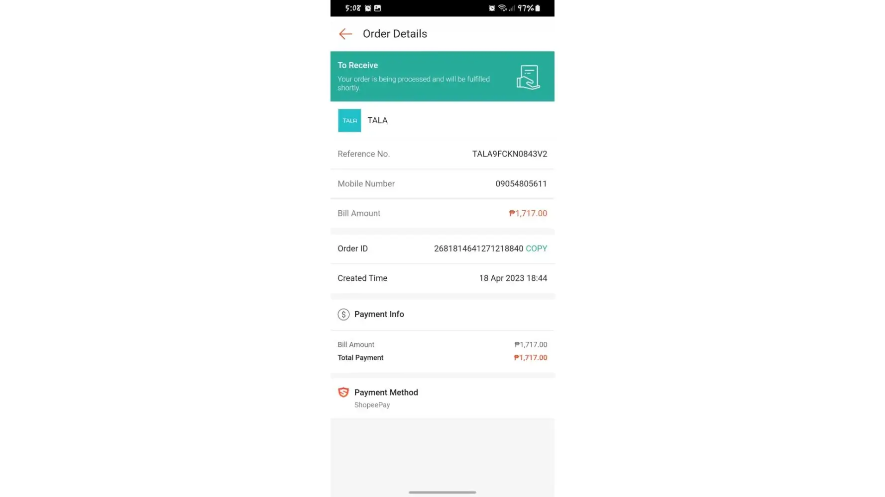 I pay my loan on tala loans April 18, 2023 at exactly 6:44 pm. Supposedly it will say order received after a few hours. But it is past 24 hours. My loan on tala add interest today. Until now the payment does not reflect on the app and the bill is still processing until now April 19, 2023. I need to refund my money. I'll pay it on gcash. Give back my money. I have proof of pictures, receipt of transaction. I emailed shopee, but they did'nt assist me.