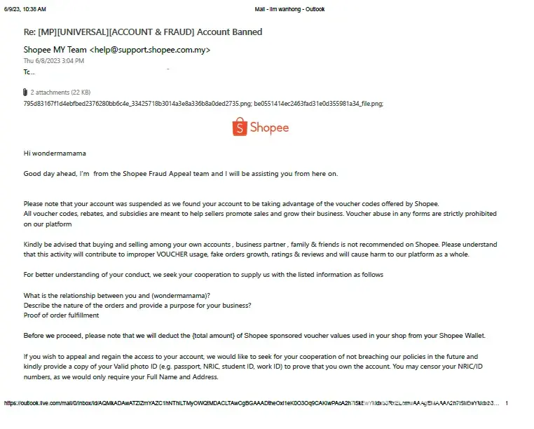 Then, my shopee account is banned. Shopee accused me of abusing vouchers without giving me the details? (see the attached photo for the email)