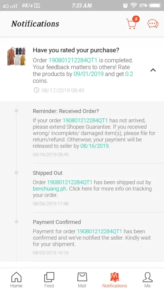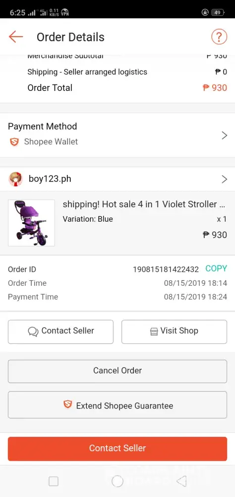 I ordered a stroller with boy123. Ph on aug.15, 2019 and I paid it the same day. Then the day I get the item is aug.26, 2019 monday. Then I pressed the completed item on the recieve. Case completed shipping. I was worried I might not get it.