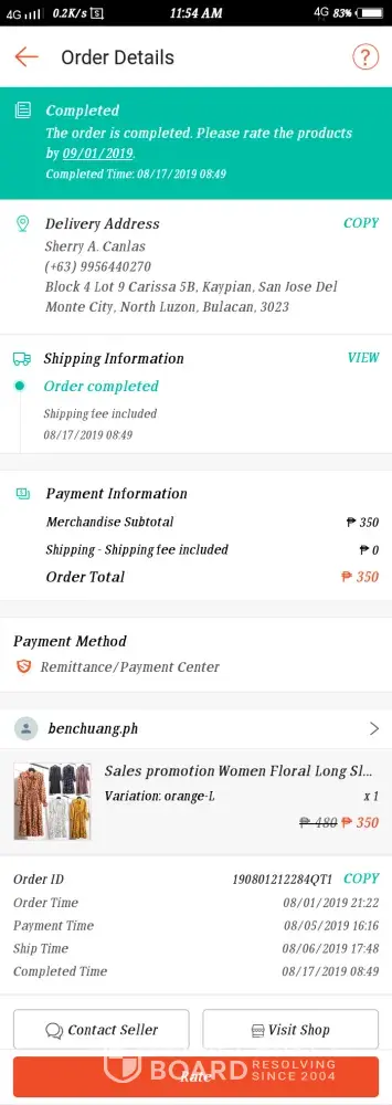 I ordered an Orange dress from benchuang.ph and paid through Bayad Center on 3 August 2019. I received a "completed" status on 16 August 2019. But actually I have never received my item. I found many other customer experienced the same problem. My order no. is 190801212284QT1 and my username is sherryarceo. Kindly give time and further investigation on why instances like this happen. Thank you.