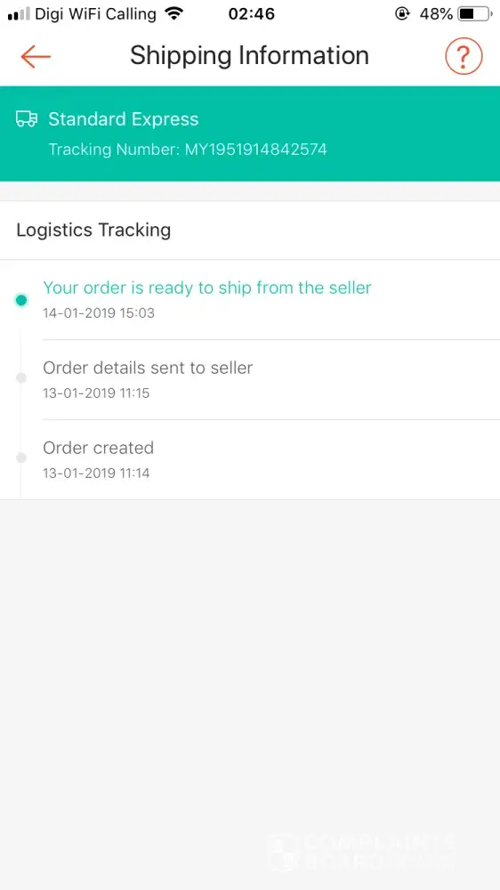 1: Logistics tracking last update was on 14-01-2019 / 1503hrs "your order is ready to ship from the seller"