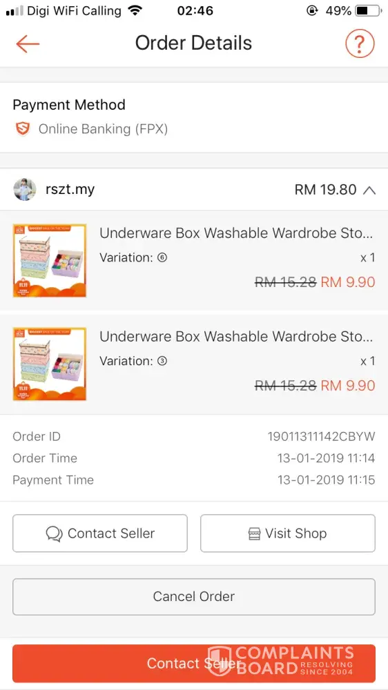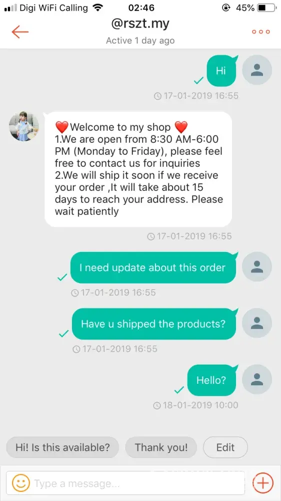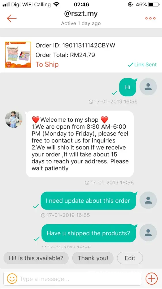 2: Contacted seller on 17-01-2019 / 1655hrs askind whether the order has been shipped but no response from seller until now, even the seller was online from time to time.