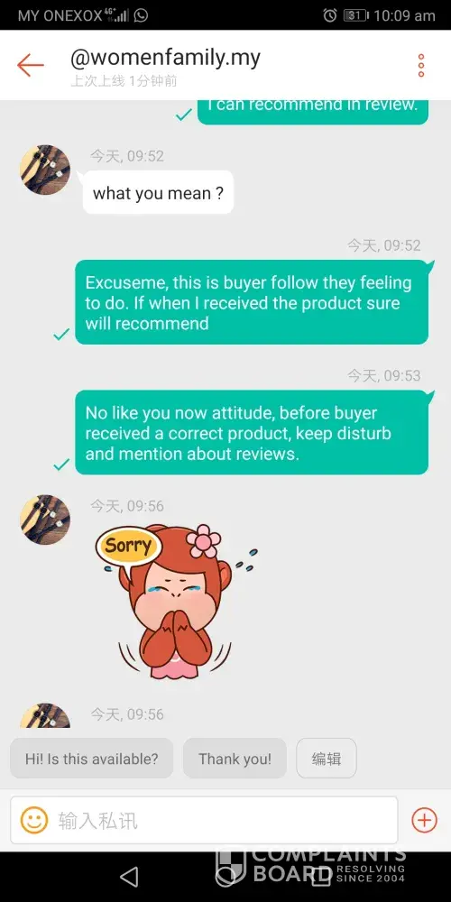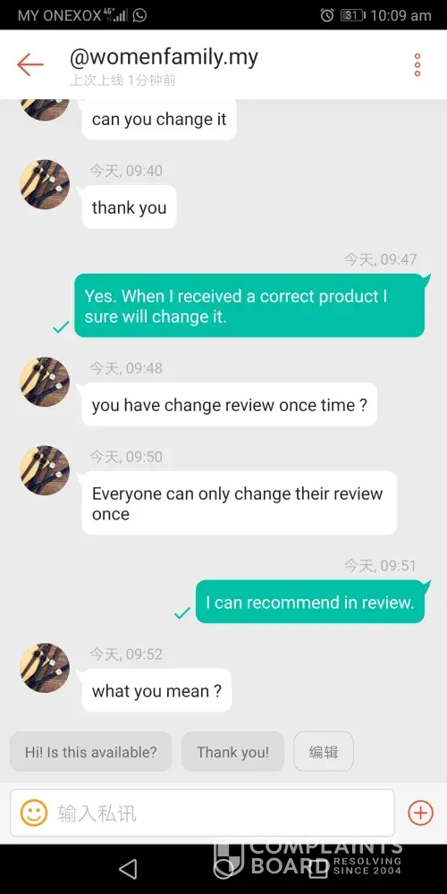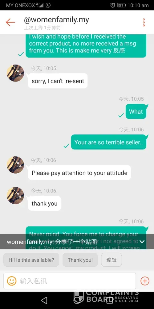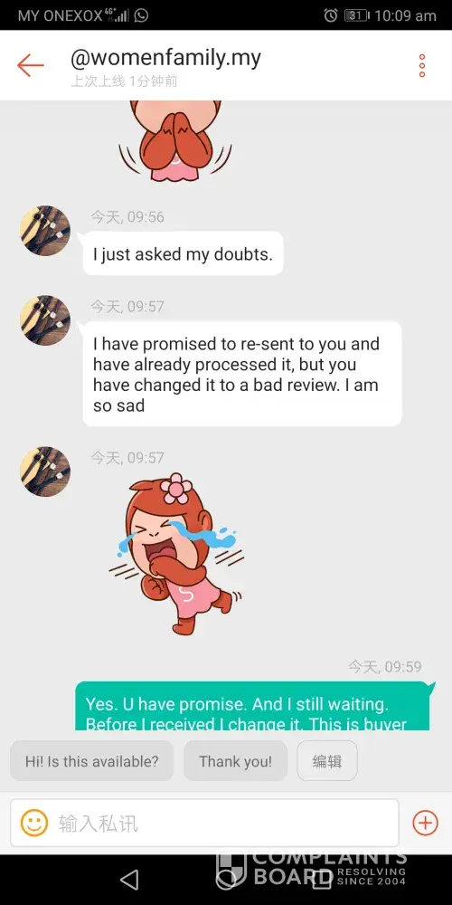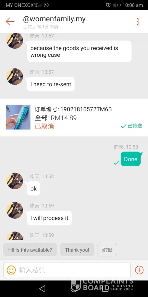 I received a msg from women family, they willing to send the cover that I order for me, I think is good service and happy they was responsible (between our communication for the resend product, the seller keep give me a wrong info, from I should no need to paid become I have to paid RM4.99) in the end I agreed with this.
