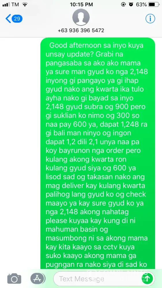 2, 148 ang gi pangayo sa courier ninjavan og nag give ko exact amoung gi ihap gyud nako ang kwarta ika tulo ayha nako gi bayad sa iya 2, 148 gyud supposedly 1, 248 so mao tu subra og 900 pero gi suklian ko niya og 300 naningala ko but gipa dayon lang nako unsay nahitabo gi dawat nako ang sulki pero naa pa gyapon 600, dapat 1, 248 ra gi bali man niya og ingon dapat 1, 2 dili 2, 1. I called him 2 times and he told me that pangitaan ra niya og paagi mo balik ra daw siya if subra kay makita daw ang total sa ilang system but wala siya ni balik and worst is that he block my number.