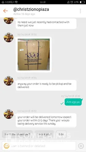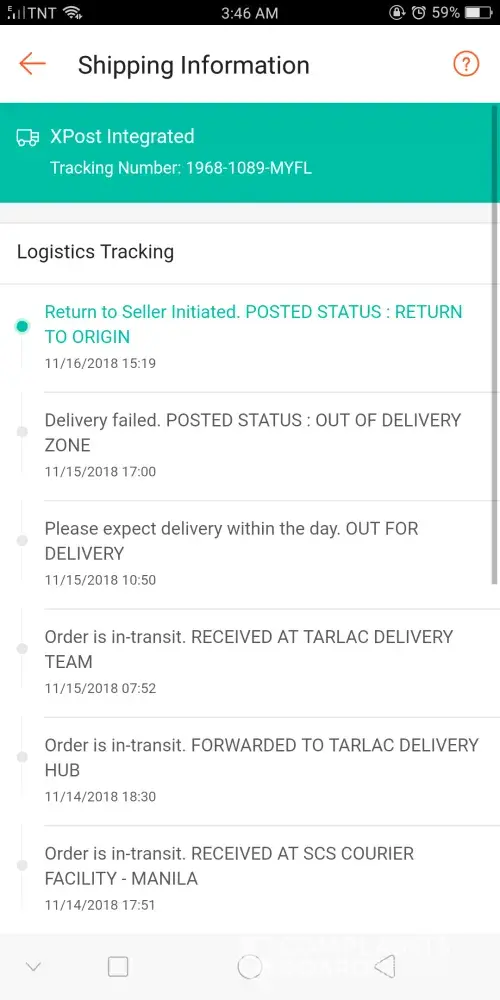 I place my order Nov. 4, 2018 it took 3 days before they process my order so since the seller sent out my order I am expecting that my order will bot affect on their 11.11 sale because a huge number of orders. Nov. 15 they texted me that my order is out for delivery and I already Prepared the exact amount of my package, I was calling them but no one picked up my calls, I'm expecting that they will contact me because it says that my address is out of their delivery zone without noticing me. Please remove this fake courier on your shop because it may always cause a problem to many consumers of your app