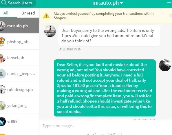 November 17, the seller submit a dispute and admitted in chat that it's a wrong advertisement, that there's a mistake. Then he asked me for a half refund. I told him that I need a full refund since it's not my fault posting a wrong ad.