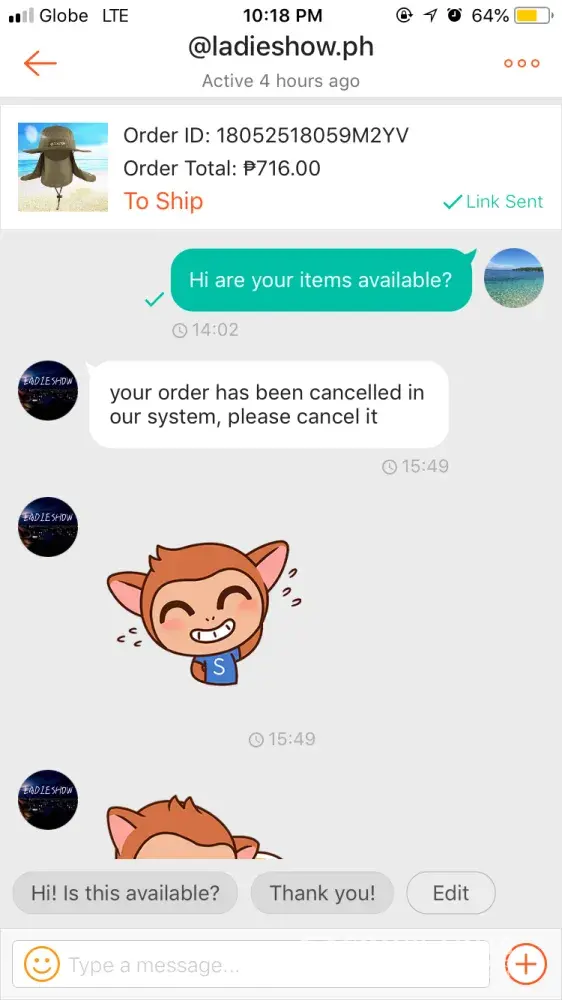 I ordered this item from ladieshow.ph on May 25, 2018. I just found out this afternoon that may order was cancelled in their system that's why they are not shipping the item. I've been waiting for this to ship for how many days. But until I contacted the seller she told me that it was cancelled. I provide screenshots of our conversation and proof that i did not cancelled the product. I was just waiting for nothing here.