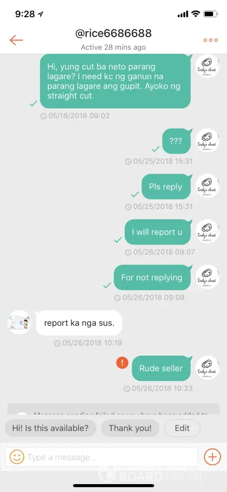 I asked many times if there is an available item that in looking for. No response at all. I told her that i might report her for not responding. She told me "report ka nga sus! (Meaning, "go on"in a rude manner)Instead of apologising for not responding.