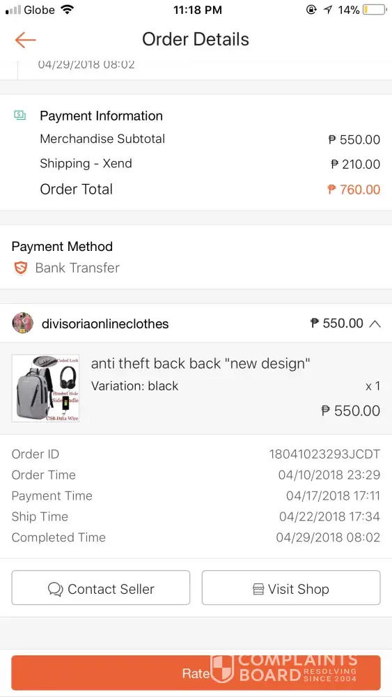 I have ordered black anti-theft backpack new design from divisorionlineclothes shop last April 10 and paid in full last April 17. I have checked my order and it was stated that order was complete but I haven't received any order yet? How did that happened? I am asking the Seller for the tracking number and yet no reply from divisoriaonlineclothes Shop.