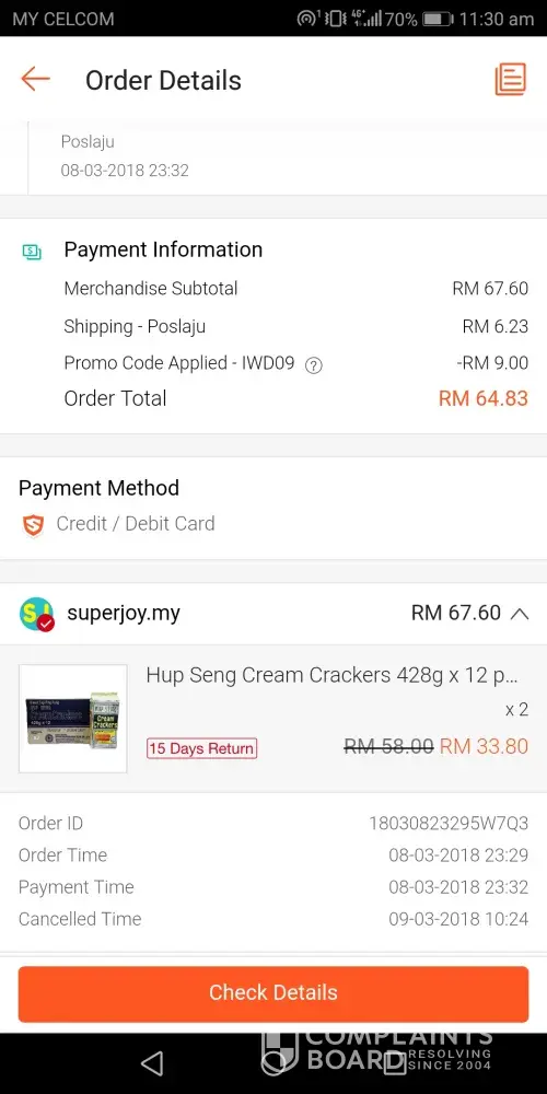 Read full complaint and 38 commentsmy order was cancelled even if I already paid for it