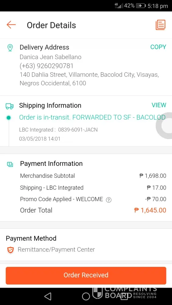 my order was to be delivered door to door... the LBC texted me with the tracking number ref#[protected] in the morning of march 19, 2018... so i expected it will be delivered to me in my home address which is Lower Zone 8, Bulua Cagayan de Oro City. in the afternoon of March 19, 2018 i recieved 4 misscalls coming from [protected] and. txt informing me...