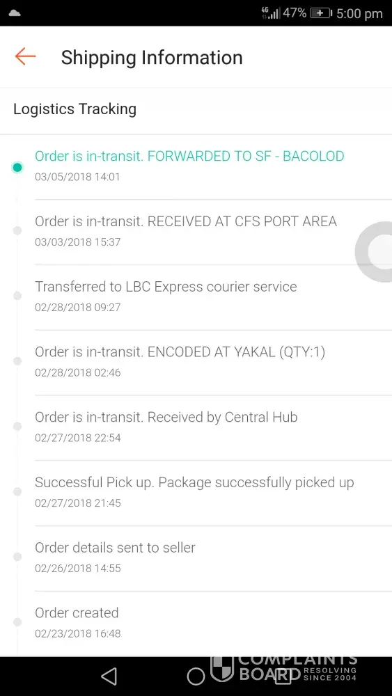 I order an item from Shopee and I choose LBC for a courier because I was expecting its more faster than the other service, but too bad the last time I checked it was already SF-bacolod 3/05/2018 so I was expecting in for the delivery in the following days, causethe said expected day to receive my item was 3/8/2018, but I receive nothing until now, it already 3/11/2018