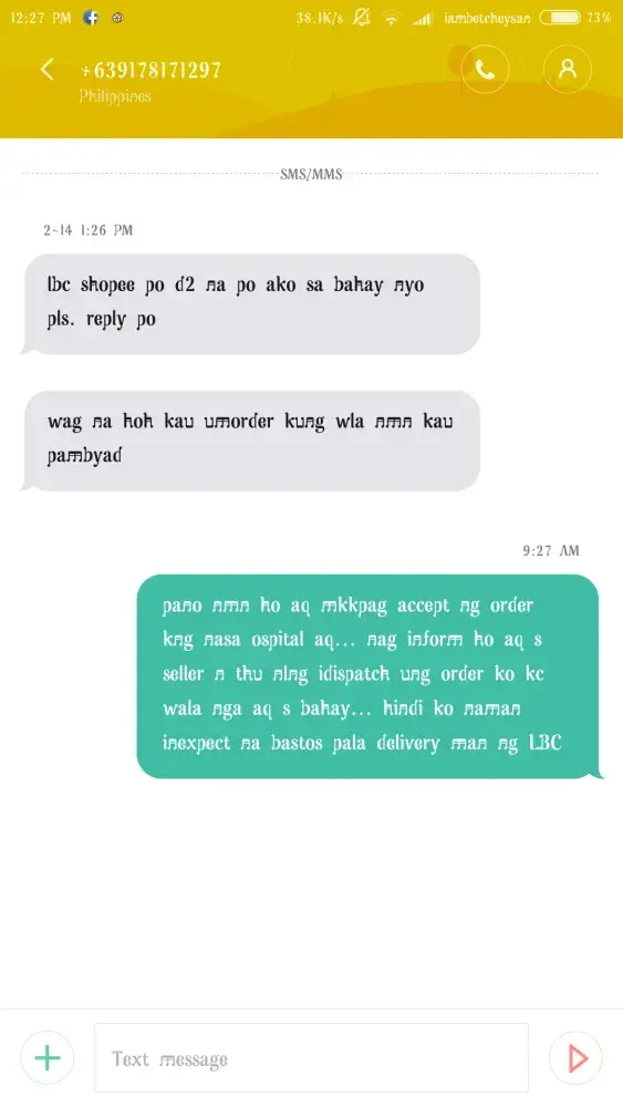 Nung una akong umorder na LBC din ang courier hindi nila tnry ideliver but instead tnag nlng nila na FAILED: House closed eh hndi nmn nwwalan ng tao sa bahay... Nung umorder aq next sa ibang seller ng ibang item, nagtry cla magdeliver pero napakabastos ng delivery man ng LBC.. Unang una nag inform aq ahead of time sa seller n walang magppck-up s bahay dahil wla aq ng ilang araw kng pde n idelay mna - pmyag nmn c seller..Ang bastos na LBC nagdeliver at wla nga nagreceive dhil dun ngtxt na wag nlng dw umorder kng walang pera!(i attached the image of the sms) -- sana gawan nyo ng paraan mga rider n walang modo!
