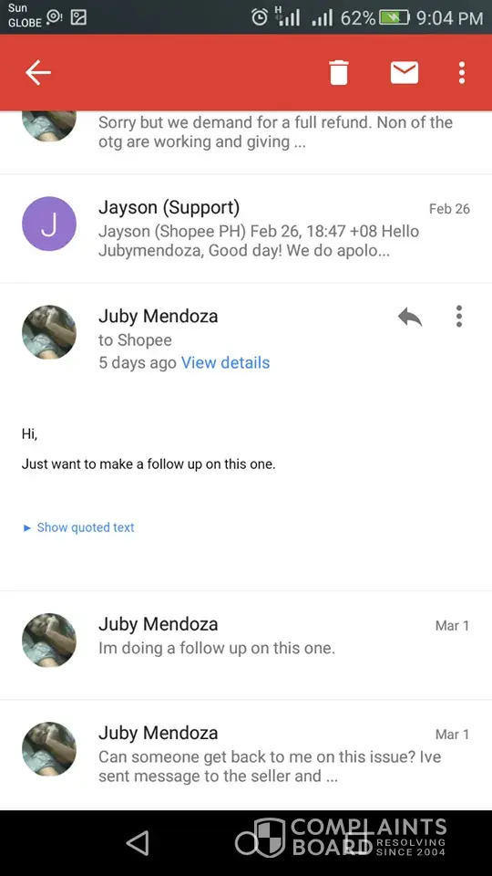 We file a complain on our issue regarding the 9 otg which are not working, we sent enough evidence on this matter including videos, hence the resolution given last march 2 was partial refund of 663 out of 1413. Since we tried to dealt on this concern still the second resolution offered was partial refund. Just to close the case we agree on the partial. One of the dispute team named Jayson, didn't even mention time frame. Here comes Mon up today i'm sending email but i haven't received any response. Also no refund was processed.