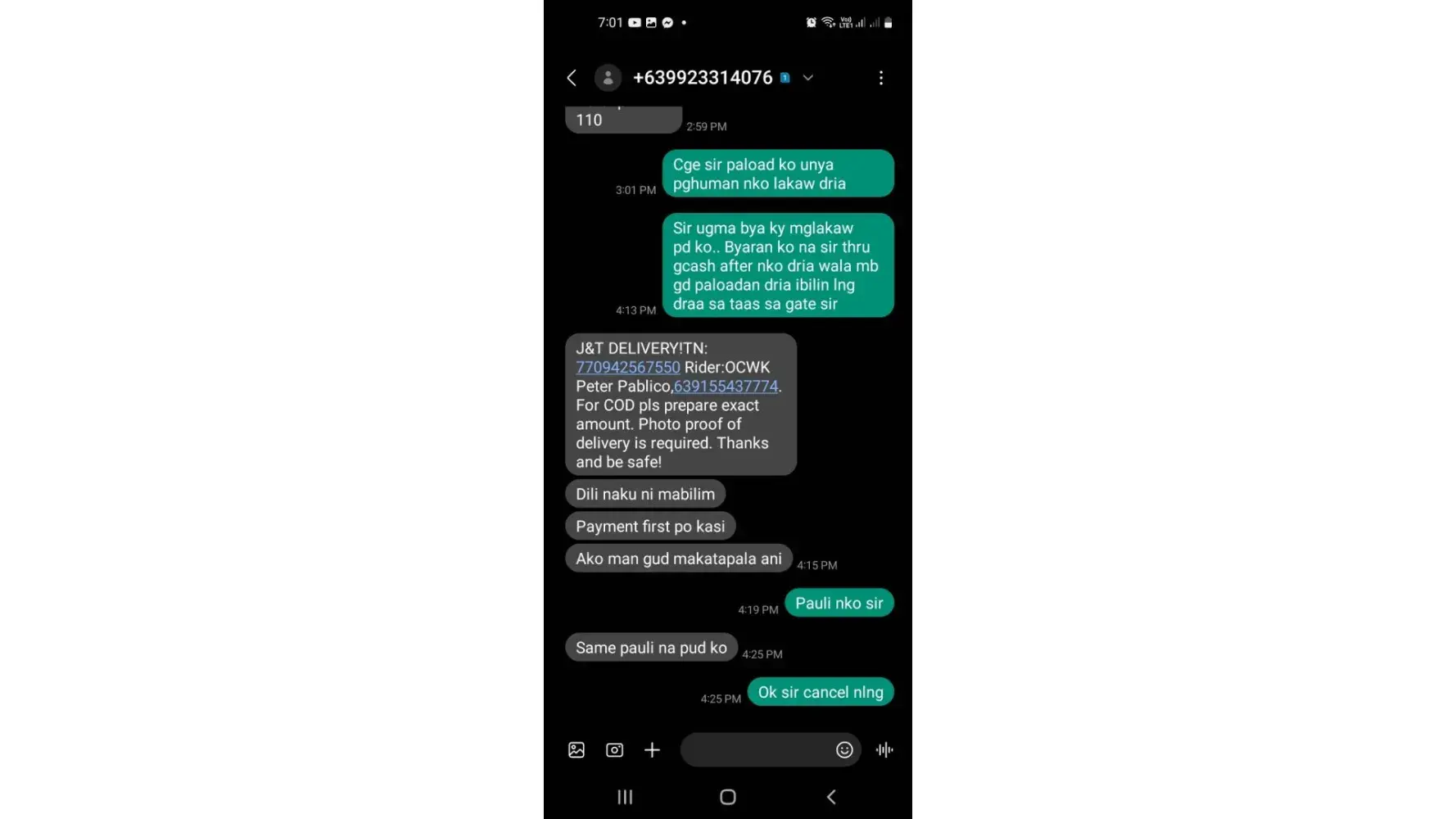 I want to complain regarding sa delivery rider dito sa area namin, nag call siya na nasa store na daw siya na medjo malayo sa bahay namin and naki usap ako kung okay lang ideliver niya right infront kung saan yung delivery address na naka lagay sa order ko since may sakit ako at hindi ko siya mamemeet sa store, but he refused and said tignan niya. After that im still polite and ask kung saan na siya until afternoon. Ngayon around 6pm tinignan ko sa shopee app ko. at tinag niya na wala ako sa area, well in fact na nasa bahay lang ako nag hihintay ng call or update niya, after few minutes tinag niya ulet na out for delivery and again tinag na buyer refused to accept the order na wala manlang siyang tawag or text at wala po akong sinabing cancel order ko. Nakaka disappoint lang na may mga ganitong rider na hindi niya nagagampanan work niya ng maayos, kung sinabi po sana niya na tinatamad siya pumunta sa bahay namin e okay lang naman po at sisikapin ko na imeet siya kahit may sakit po ako. Napaka bastos, sayang ang oras na hinintay ko ang parcel ko at the same time hindi siya naawa sa seller na nag effort para ipadala din yung item. I hope mabigyan siya ng disciplinary action. Thank you. Below attached proof ng usapan namin and yung pag cancel niya ng order ko, kindly check the time. Again, thank you.