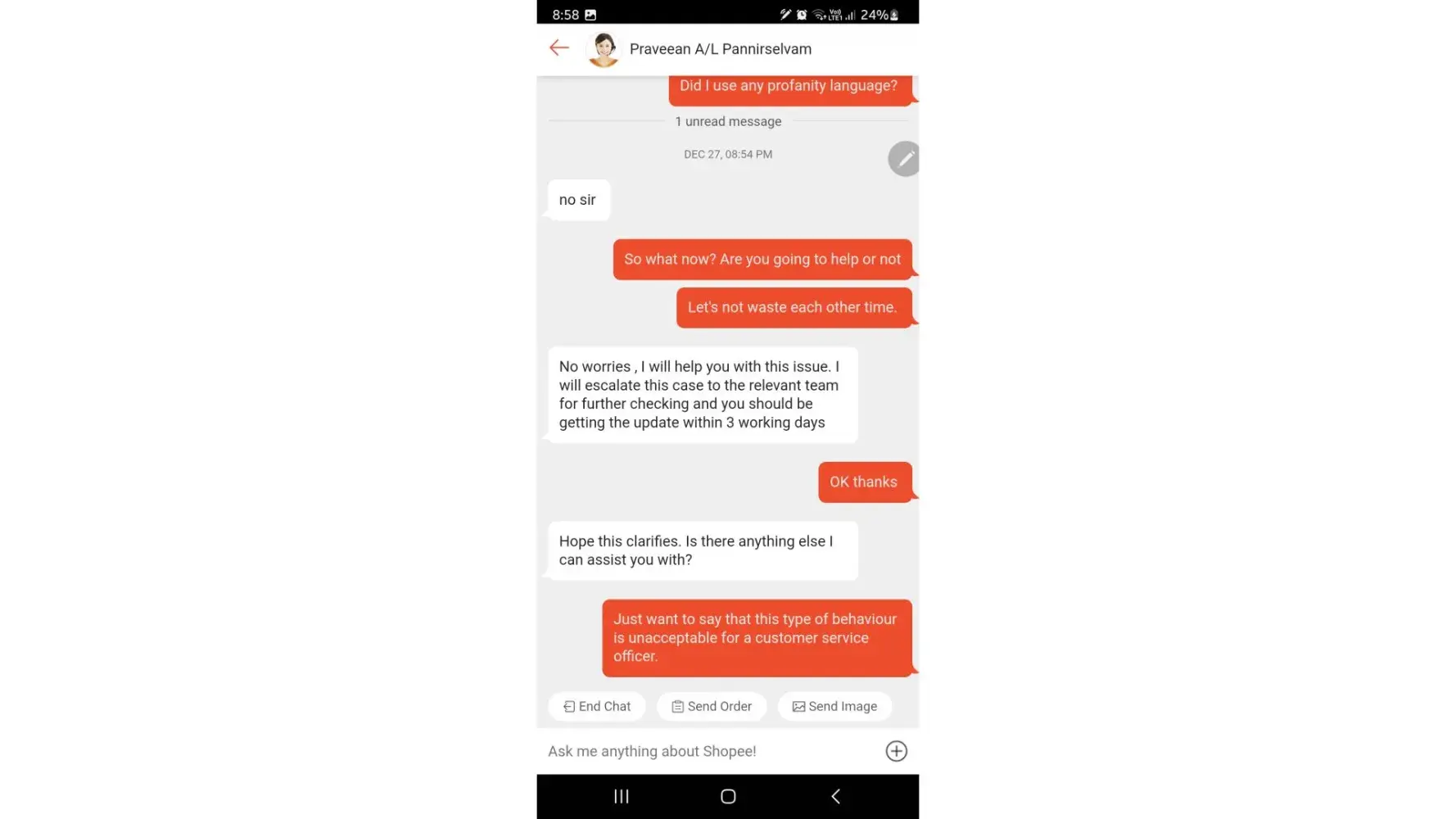 On Tuesday, 27dec22 at around 8pm+ I was supposed to chat with a shopee agent to resolve my item delisted issue but instead of having my issue resolved, I encounter a bad attitude customer service officer by the name of Praveean A/L Pannirselvam.