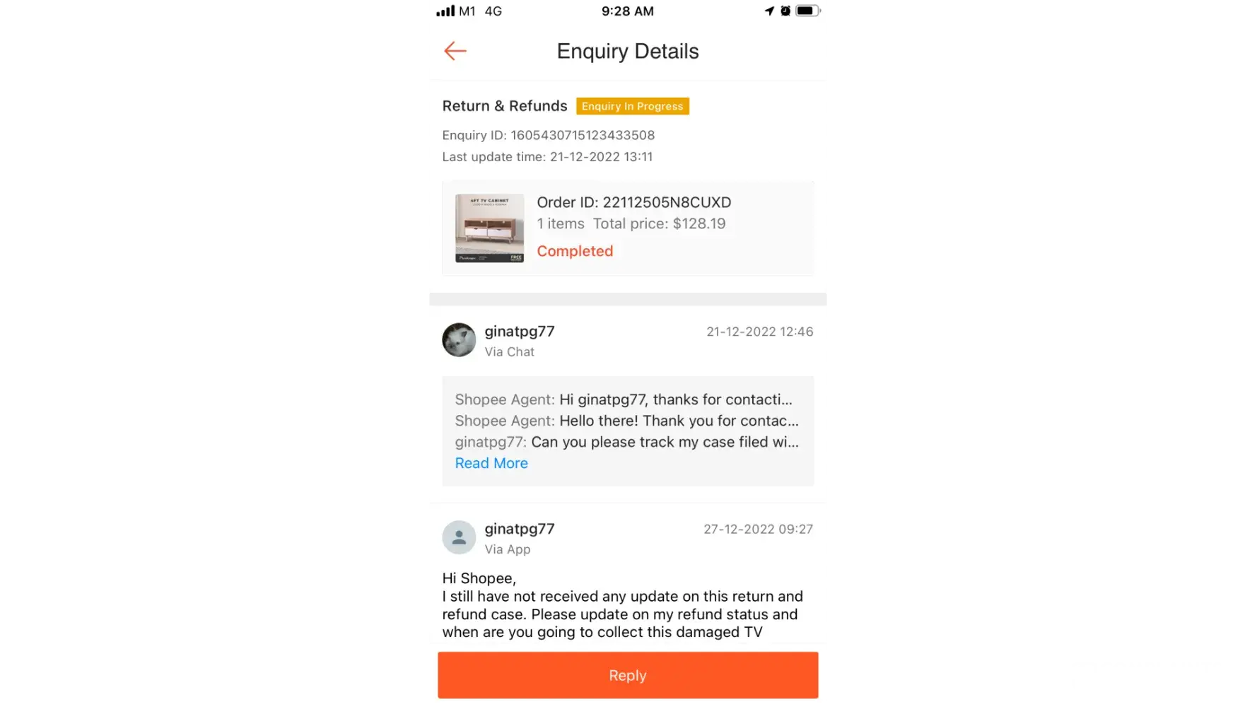 I contacted Shopee and have also mentioned that this is a big size item, a TV console. CS assisted to arrange the rubbish Ninja Van (a logistic company) to pick up on 16 Dec 2022, but again no show and no call after waiting from noon to 10:00 P.M. (I have to apply urgent leave to wait for the pick up)