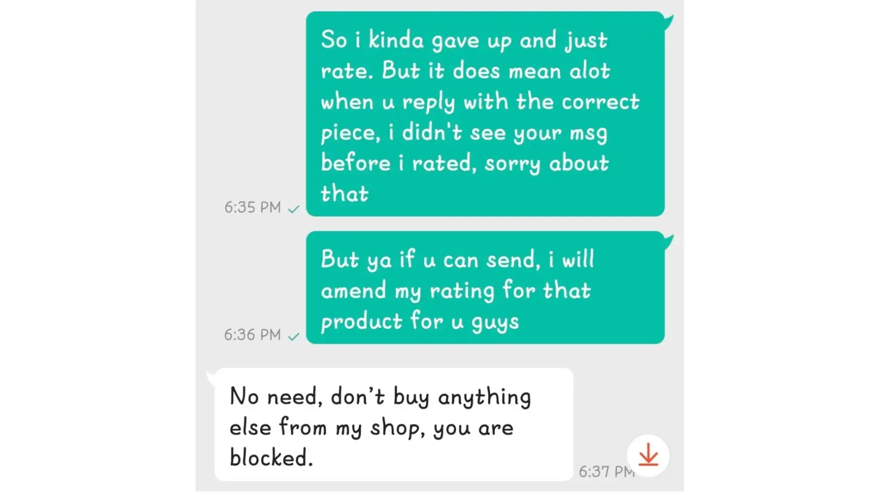 Then I happened to see the chat that the seller replied. I then apologised about the rating and told seller how appreciative I was for him/her getting back, and that I didn't see his/her reply before rating.