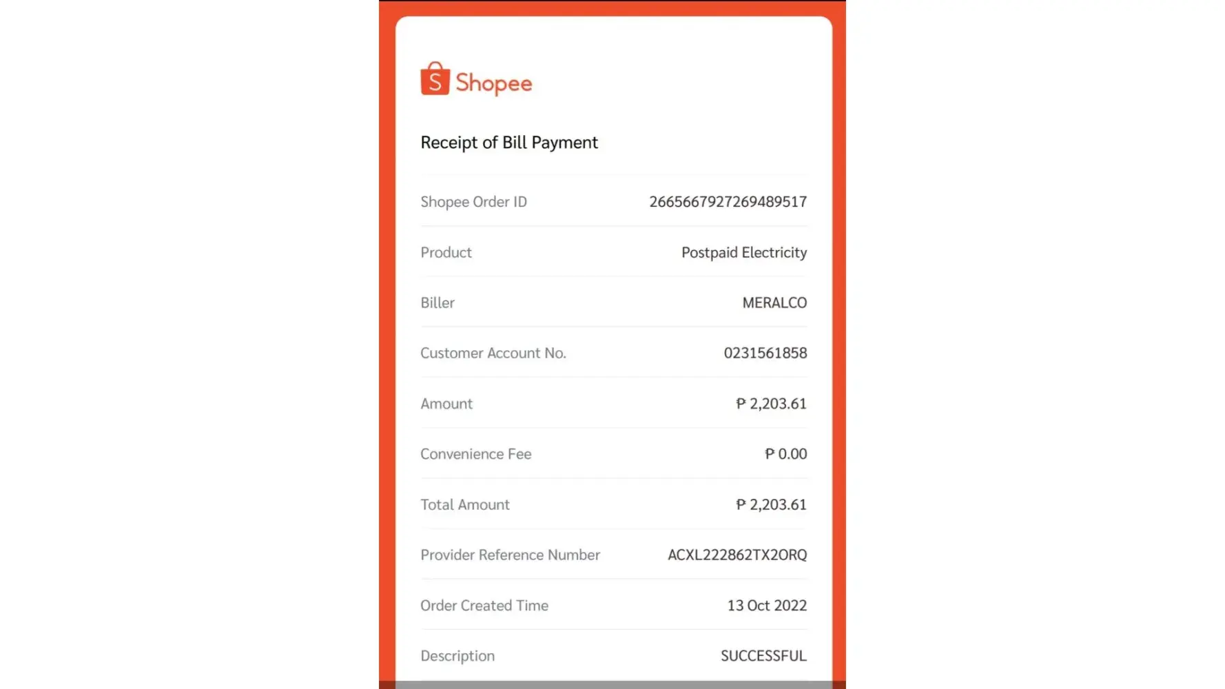 Please I need your help badly. Nung Oct. 13, 2022, nagbayad ako sa bills payment ng Shopee ng aking meralco bill amounting to Php 2,203.61. I received a notification and my online receipt that my transaction was successful and completed. However, I received my meralco bill last Nov. 2, 2022 stating na hindi pa bayad ang bill ko kaya pumatong na ngayon sa aking latest bill statement yung previous months bill. Kaya ngayon obligado ako bayaran ng one time big time yung 2 months bill ko sa Meralco dahil may disconnection notice na kmi.