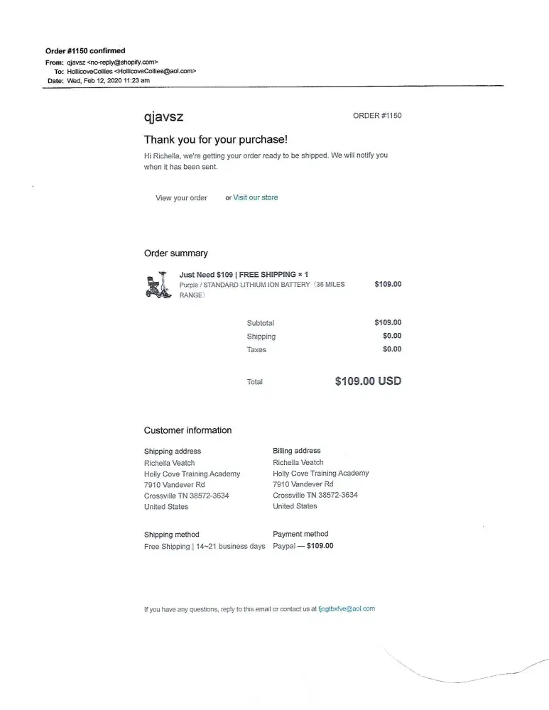 Order #1150 Order was delivered to an address in Johnson City instead of my address. I never got my order. My address was correct on the invoice, but the item was sent to the wrong address. It was delivered to 244 Ford Creek RD, Johnson City, TN 37615; my address is 7910 Vandever Rd, Crossville, TN 38572. The item was an electric scooter, purchased for $109.00.