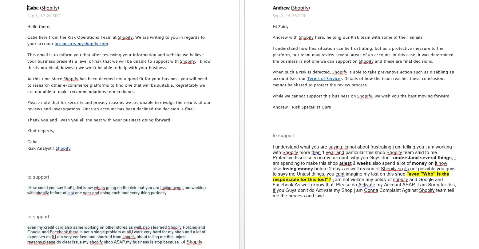 i make a shop on Shopify, but when i am attach my credit card with shopify suddenly my account is going to Block, even i am telling you i am also run Multiple Shops on Shopify, then i am Complaint on Shopify Live chat support, after that a person with name of Gabe connecting me and said its not open again without telling any reason, then i am telling my stakes to connect with shop, i am going to attach a File to clear see the conversion between us.