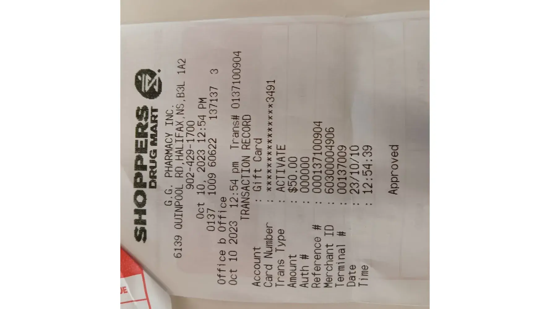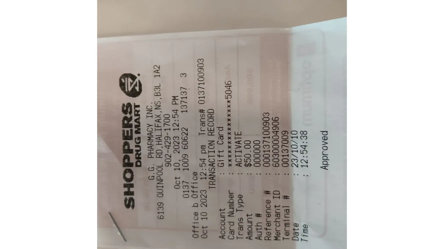 Purchased Oct. 10. 2023 at Shoppers Drug Mart, G.G. Pharmacy Inc., 6139 Quinpool Rd., Halifax, NS, B3L 1A2, Tel.: [protected]
