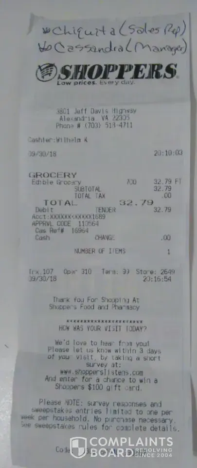 I've been shopping at this Shopper's randomly for over 10+ years, as I'm part of the community! Cassandra has only worked for this Shopper's store# 2649 for 2 years. This is my first problem that I've encountered with a cashier. I usually shop at other retailers, but wanted to see the new renovations to the store since it was recently constructed! I was displeased with the way this cashier handled her job, me as a customer, and her failure to perform her role at a descent level at least, if not professionally. She also seemed paranoid and fidgeted a lot, unlike the original cashier (Wilhelm, K). It made me uncomfortable! This is a neighborhood store. I shouldn't have to come into avoid this cashier, if she'll be working there any longer. She should perform her job with pride rather than being nonchalant and again, playing victim when approached by the manager. She's not paying for anything. This is food. If you act this way in role working around food, then this isn't a job for you!
