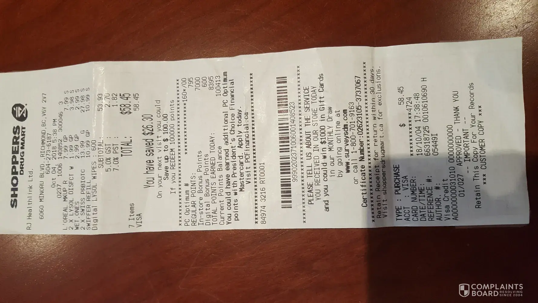 On Thursday October 4, I bought a few items at Shoppers Drug Mart (store no. 0237 at 6060 Minoru Blvd, Richmond, BC). Total amount $58.45 charged to my CIBC Visa. My PC Optimum no. is [protected]