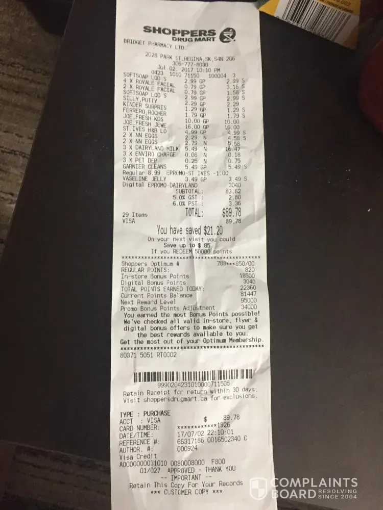 • Bonnie being unable to provide any written proof of any such policy and the lack of this policy being visible for all customers to see and be consistently applied to all Shopper Drug Mart locations.