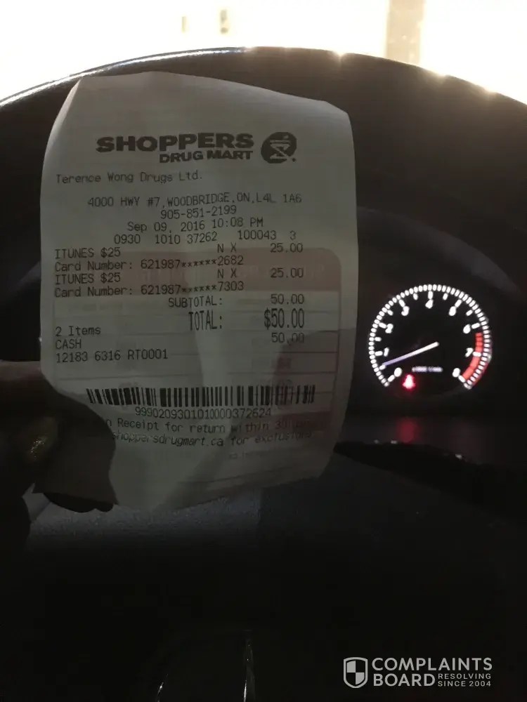 I visited the shoppers drug mart on Highway seven and Weston in Ontario. I purchased to iTunes card at $25 each. It was only after I my purchased that I saw that there was a $50 card. So I immediately went to return the 2 $25 iTunes card to exchange it for the $50 card. I was told by the employee there that I could not or refund The iTunes card for exchange it. The employee at the Shoppers drug mart was very rude and had appalling customer service. I asked her if she was sure that I could not refund or exchange of the item. She said in verbatim "I am damn sure".