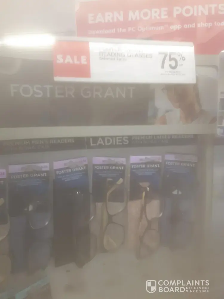 My wife purchased 2 pairs of foster grant readling glasses advertised at 75% off on selected types. I thought it was a great deal and went back to store and bought 4 more, but immediately after leaving looked at the receipt and it was 50% off not 75% so went and talked to customere service agent and to take a photo of the signage. There was no indication that other types were on sale at all and no sticker on the glasses themselves apart from full price of 29.99 each. I had the customer service agent go through all the racks all loaded with glasses and there was not asingle pair that said 75% off and ALL priced at 50% off. In total we paid $89.94 + $4.50 GST rather than the bill that should have been $44.99 + $2.25 GST a $47.23 total cost a $47.20 difference.