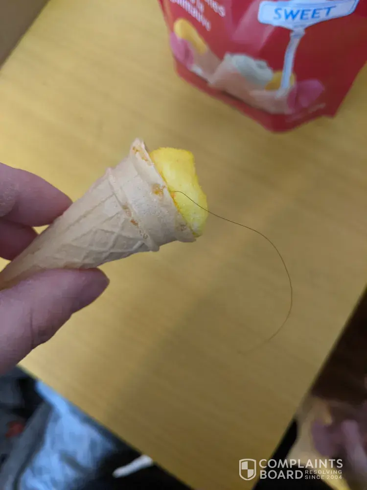 I just bought a bag of marshmallow cones by Carnaby Sweet and there is a long hair stuck in the marshmallow of one of the cones. It' s quite gross and clearly not mine since it is embedded in there.