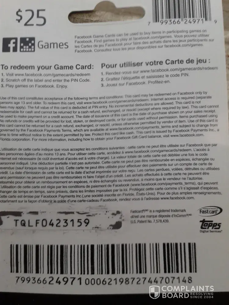 Cannot redeem Facebook Card pin number no good please correct this for me