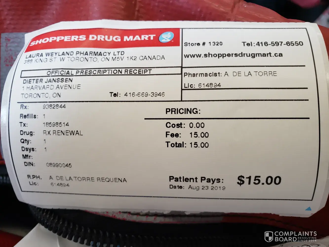 A copy of this complaint has been forwarded to the Ontario Ministry of Health.
