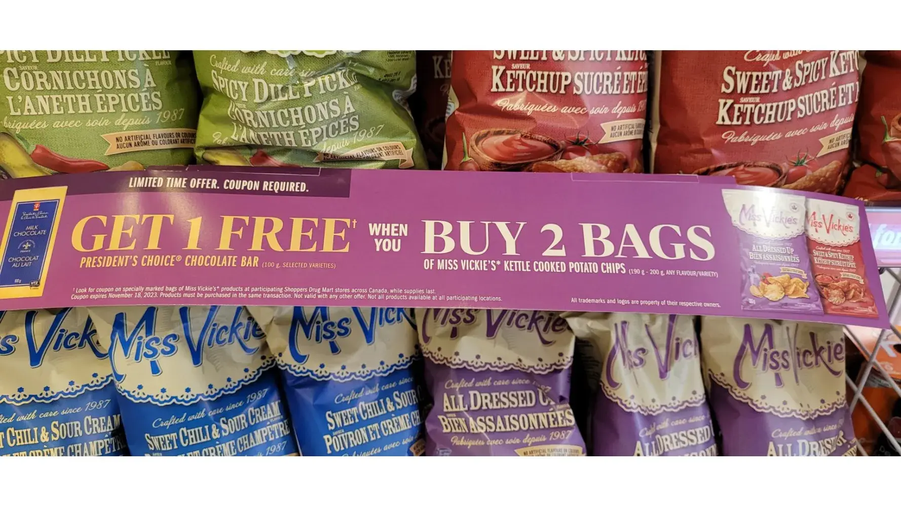 Shoppers Drug mart buy a PC chocolate bar and get 2 bags Miss Vicki chips free.All the coupons have been removed from the chips so nobody can take advantage of the deal